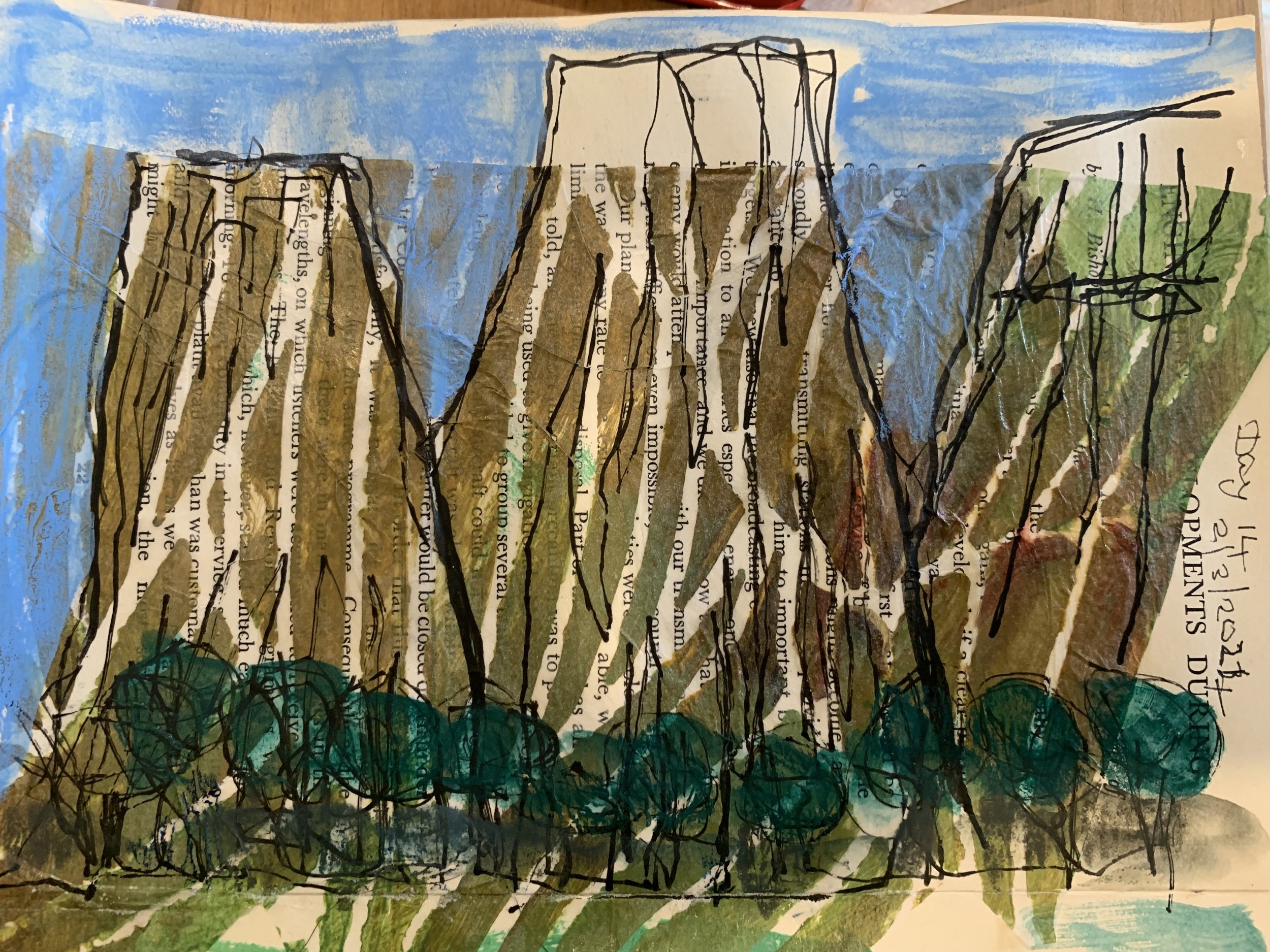 Now I need something else to make me continue doing art every day. I am working on a theme of natural vs man made - how I love being in nature, particularly sitting in my garden but we need the man made structures to keep our daily life going.